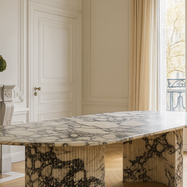 This luxurious marble table is crafted from viola marble, renowned for its rich, multi-tonal palette of deep purples, warm ambers, and golden veining. Its natural patterns create a striking, artistic statement, turning any space into a showcase of elegance and sophistication. Amber Overture combines timeless beauty with exceptional craftsmanship, making it a centerpiece of luxury interiors.