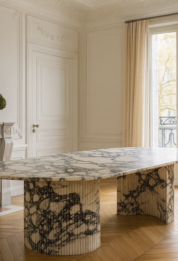 The Aurelia Marble Table is a statement of timeless elegance, crafted from exquisite marble with striking natural veining that turns each piece into a work of art. Its elongated oval top rests upon sculptural pedestal bases, merging strength with refined design. The soft curves of the structure contrast beautifully with the bold black and white marble patterns, making it a centerpiece that exudes both luxury and modern sophistication. Perfect for a grand dining room or an elegant meeting space, this table embodies the harmony of natural stone and architectural form.